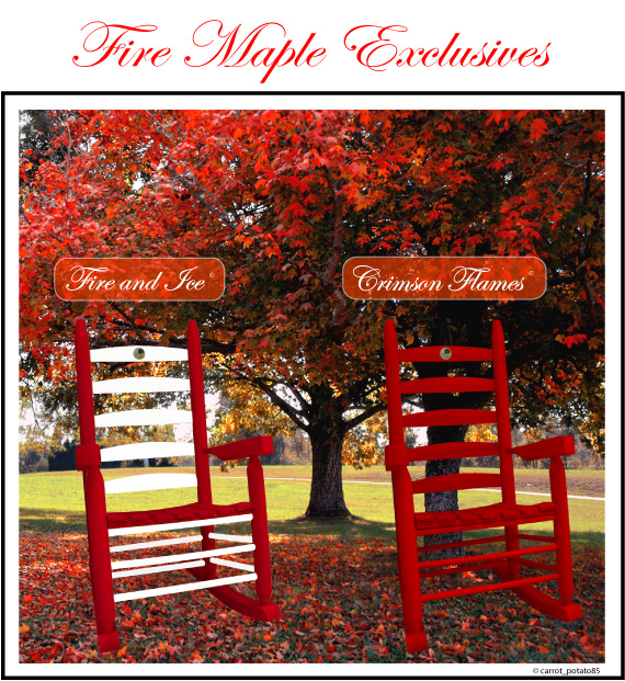 These two distinct rockers are exclusive to the Fire Maple Rocking Chair Company. The two-toned Fire and Ice model is adorned in a beautiful color combination of scarlet and white, while Crimson Flames displays a solid deep burgundy. We only use color stains on these, because the grains of the fire maple are too beautiful to be covered up by paint. By staining them we are still able to uniquely accent your rocker with color, while allowing the grain to remain visible! Both models are constructed of pure maple and are available in our Standard and Jumbo models. Either one is bound to beautifully accent your porch or room!
